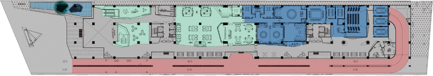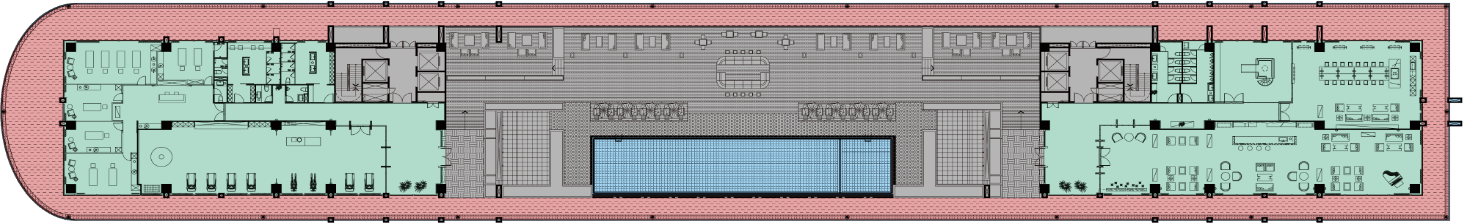 The public space on the top floor planning includes a total length of 30-meter starry sky infinity swimming pool, a fitness center, a Sky Lounge, and other leisure, sports, and entertainment comprehensive service facilities, there is a special (total length of 330 meters) ring-shaped aerial landscape runway, provide the unique leisure sports experience for staying customer.